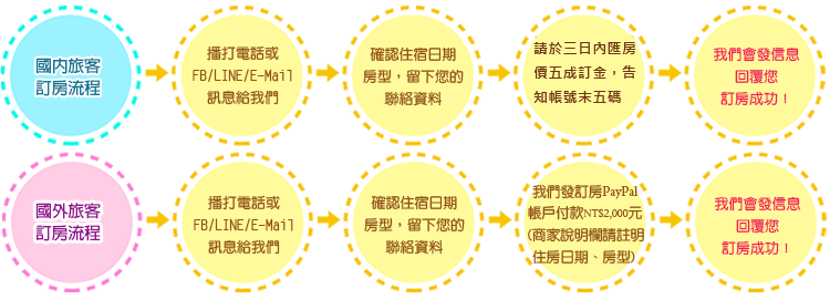 匯款完成後,煩請告知交易帳號後五碼,或匯款單據並請註明:姓名、住宿日期、房型、人數,即完成訂房手續。
